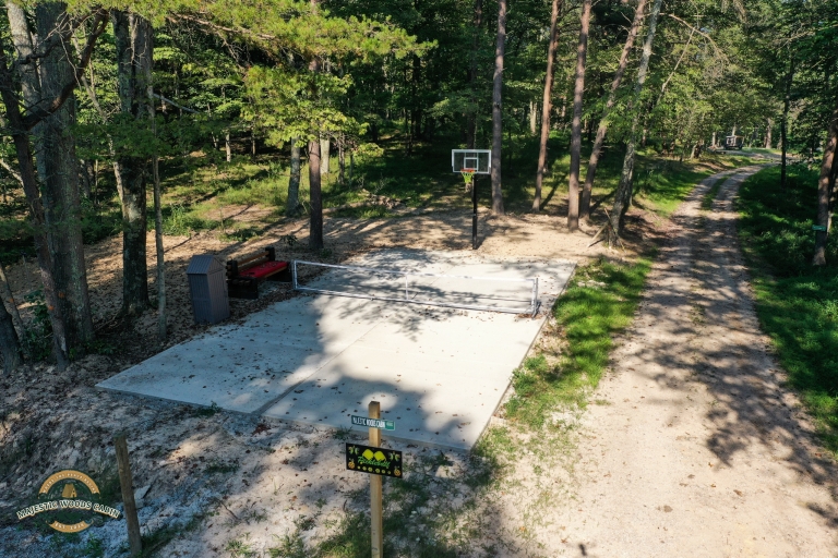Majestic Woods cabins offer a peaceful experience in the woods. You can enjoy a complimentary coffee or tea on the deck while listening to nature wake up or watching deer and other critters wander through the woods. Here you can spend your time in the hot tub, outdoor shower, playing Disc Golf in the woods, playing pickleball or basketball, streaming movies on your favorite streaming app, taking a walk through the woods or just sitting by the campfire. We are animal friendly and provide outdoor dog runs for each cabin to keep your pets safe while you enjoy the outdoors.